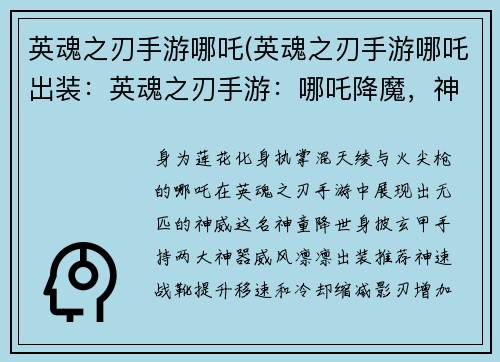 英魂之刃手游哪吒(英魂之刃手游哪吒出装:英魂之刃手游:哪吒降魔,神威凛然)